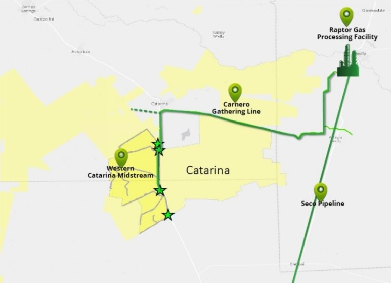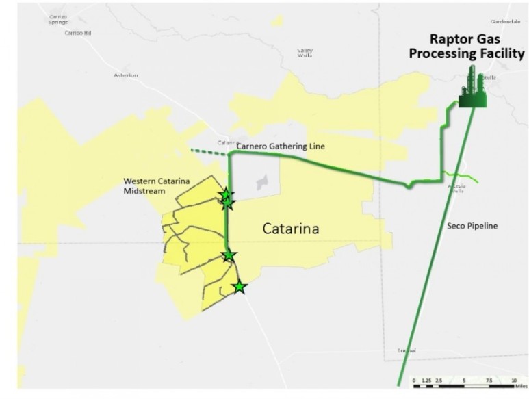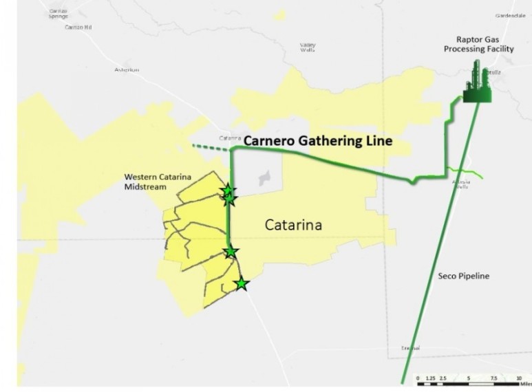 우리는 Carnero Gathering Line을 완전히 소유하고있는 Carnero G & P LLC의 50 % 지분을 소유하고 있습니다. 45 마일 길이의 천연 가스 파이프 라인은 Mesquite Energy의 Catarina 및 Comanche 자산에서 Raptor 가스 처리 시설로 천연 가스를 운송합니다.
