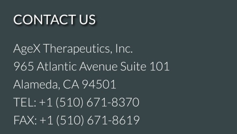 AgeX의 임무는 인간 노화의 '시계 메커니즘'에 대한 새로운 이해를 바탕으로 생물학적 노화를 목표로하는 새로운 치료제를 개발하고 상업화하는 것입니다. 우리는 인간의 건강과 수명을 연장하기 위해 이러한 기술을 인간 의학에 적용 할 계획입니다.