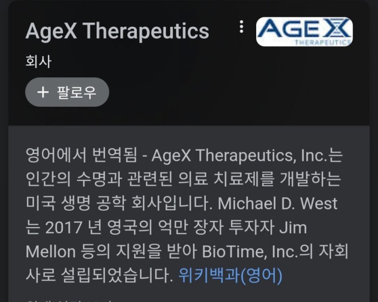 오늘은 전일대비 상승율 1위로, 315%의 등락율을 보인 AgeX Therapeutics, Inc.에 대해 리뷰를 해 보도록 하겠습니다.