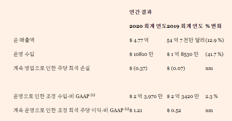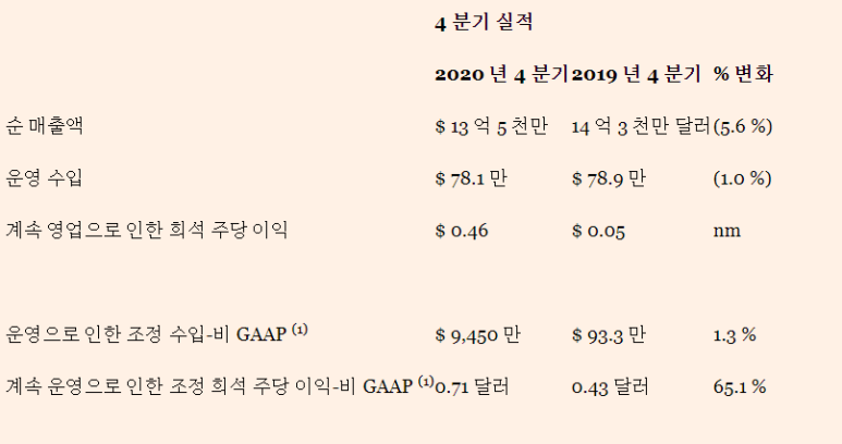 일반 주주에 귀속되는 계속 운영에서 비 GAAP 조정 주당 이익 0.71 달러 2020 년 4 분기에 0.43 달러 2019 년 4 분기에는 주로 유리한 소득세, 낮은이자 비용 및 운영으로 인한 조정 수입 증가로 인해 발생했습니다.