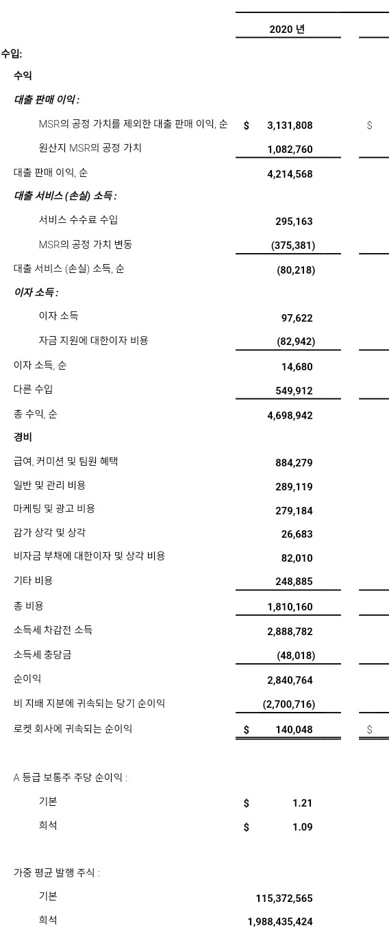 1 "GAAP"는 미국에서 일반적으로 인정되는 회계 원칙을 의미합니다. 2020 년 8 월 6 일에 Rocket Companies의 주식은 NYSE에서 거래되기 시작했으며이 날짜 이전의 어떤 기간 동안에도 발행 주식이나 주당 수익 계산이 없었습니다. GAAP에 따라 2020 년 12 월 31 일로 종료 된 3 개월 및 12 개월의 기본 및 희석 주당 순이익 계산에는 2020 년 8 월 6 일부터 2020 년 12 월 31 일까지의 기간 만 포함됩니다.이 문서의 "비 GAAP"섹션을 참조하십시오. 회사의 비 GAAP 측정 및 주식 수에 대한 자세한 내용은 재무 측정 "및"GAAP 비 GAAP 조정 "을 참조하십시오. 이 문서 전체의 표에있는 특정 수치는 반올림으로 인해 발이 맞지 않을 수 있습니다.