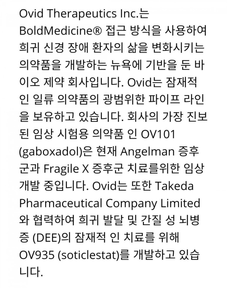 2017 년 협력 계약에 따라 Takeda는 Ovid 최대 수신 가능 $ 8,500 만 임상 3 상 시작을 포함하여 규제 이정표에 대한 지불. Ovid 여러 희귀 간질에서 개념 증명의 성공적인 시연을 통해 soticlestat의 글로벌 개발을 주도했습니다.