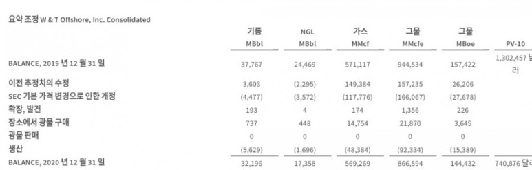 2020 년 말 SEC 증명 매장량을 기준으로 2020 년 말 W & T의 예비 수명 비율은 SEC가 증명 한 매장량을 기준으로하고 2020 년 생산량은 9.4 년이었고 NYMEX 스트립 가격 매장량 기준으로는 11.0 년이었습니다.