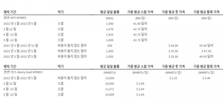 회사의 현재 미해결 파생 상품 포지션 목록은 아래 표와 W & T 웹 사이트의“재무 정보”탭 아래의 투자자 관계 섹션에 포함되어 있습니다.