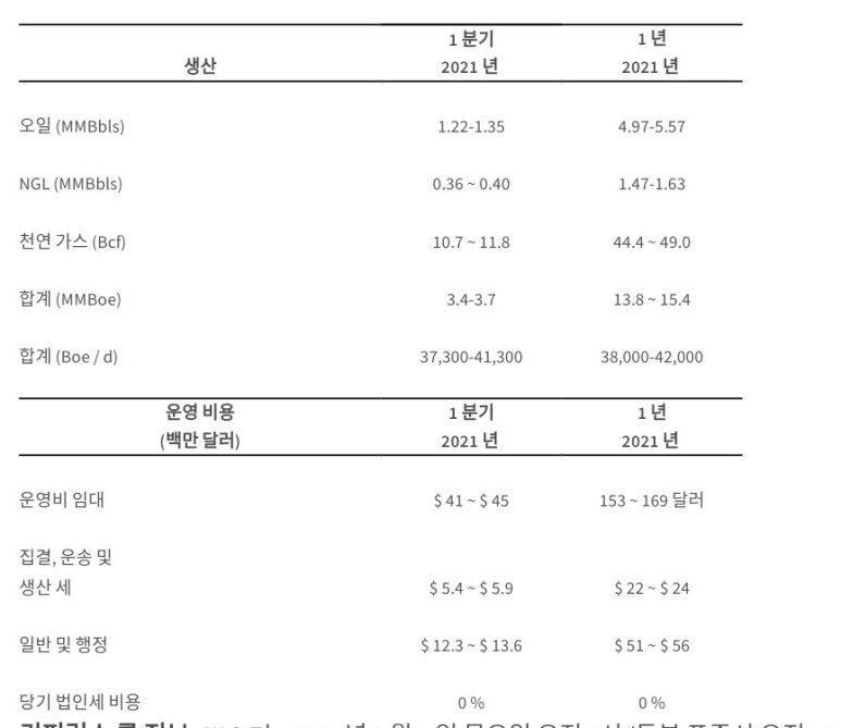 2021 년 1 분기 및 연간 생산 및 비용 안내