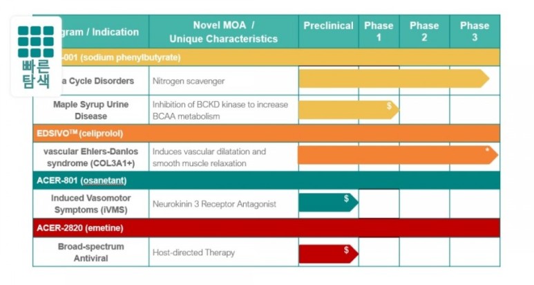 에이서 (Acer)는 미충족 의료 요구 사항이 심각한 희귀 및 생명을 위협하는 심각한 질병에 대한 치료법의 인수, 개발 및 상업화에 주력하는 제약 회사입니다. Acer의 파이프 라인에는 COVID-19 환자 치료를위한 염산 에메틴; 요소 순환 장애 (UCD) 및 메이플 시럽 소변 질환 (MSUD)을 포함하는 다양한 선천성 대사 오류의 치료를위한 ACER-001 (맛이 가려진 즉시 방출되는 나트륨 페닐 부티레이트 제제), 확인 된 III 형 콜라겐 (COL3A1) 돌연변이가있는 환자의 혈관 엘러스-단 로스 증후군 (vEDS) 치료를위한 EDSIVO ™ (celiprolol); 및 유도 된 혈관 운동 증상 (iVMS)의 치료를위한 osanetant. Acer의 각 제품 후보는 상대적으로 위험이 덜한 프로필을 제시하는 것으로 여겨집니다.