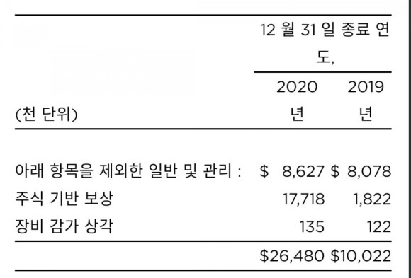 2020 년 12 월 31 일 및 2019 년 12 월 31 일로 종료되는 연도의 일반 및 관리 비용은 다음과 같습니다.