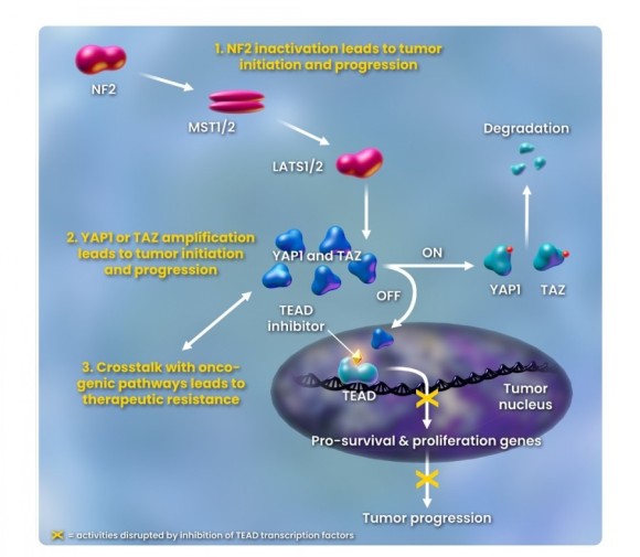 Hippo 경로는 세포 운명, 극성, 증식 및 생존뿐만 아니라 장기 크기 및 조직 항상성을 조절하는 중요한 신호 전달 경로입니다. Hippo 종양 억제 경로의 돌연변이로 인한 TEAD의 비정상적인 활성화는 종양의 형성 및 생존과 기존의 여러 치료법에 대한 내성 발달을 유도 할 수 있습니다. Hippo 경로는 암 발병의 주요 원인으로 널리 받아 들여지고 있으며 모든 암의 약 10 %에서 유 전적으로 변경되며, 이러한 유전 적 변경은 일반적으로 환자 결과가 좋지 않은 것과 관련이 있습니다.