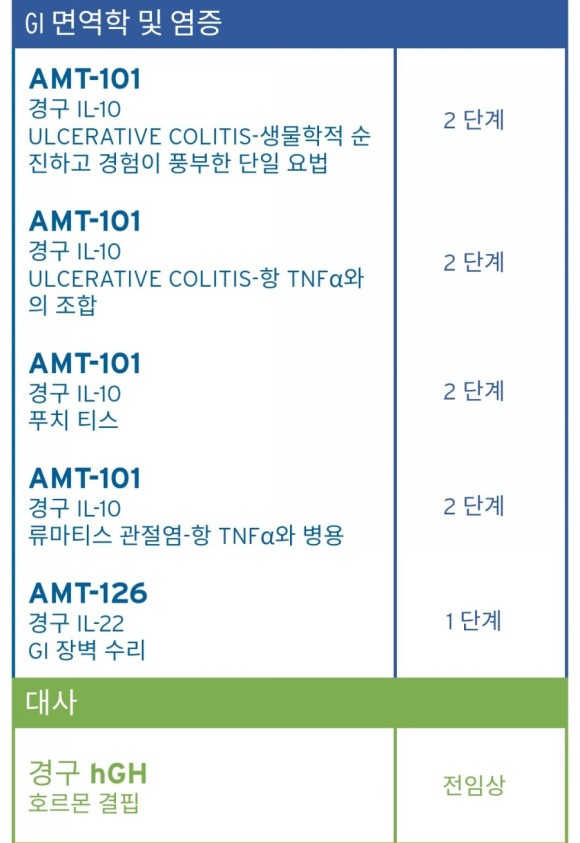 AMT-126은 인간 인터루킨 -22 (hIL-22)의 새로운 GI 선택적 연구 구강 융합으로, 장 상피 장벽의 결함과 관련된 질병에 대해 개발 중입니다.